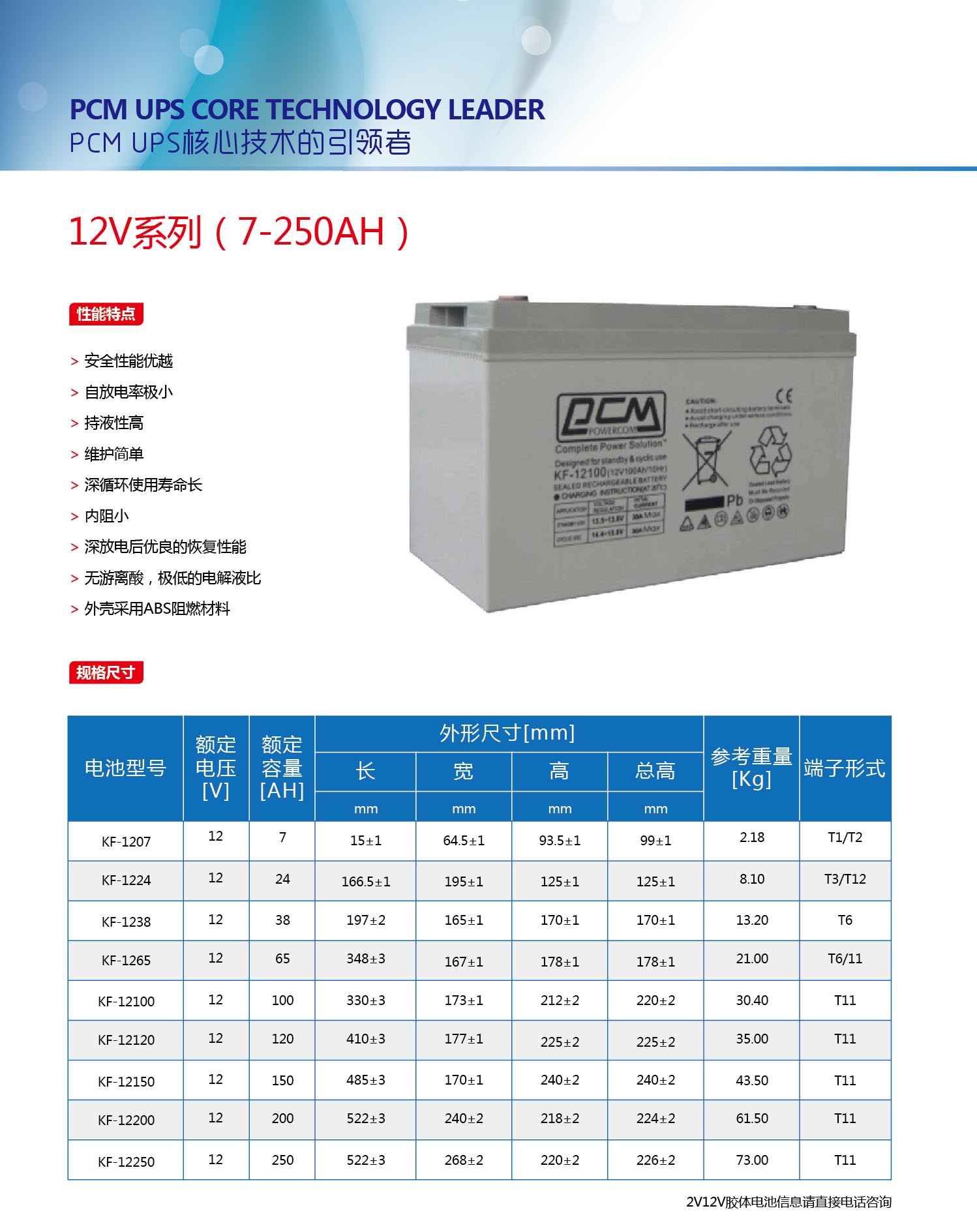 产品型号:12V系列(7-250AH)KF-1207 KF-1224 KF-1238 KF-1265 KF-12100 KF-12120 KF-12150 KF-12200 KF-122502V系列(100-3000AH)KF-100 KF-200 KF KF-300 KF-400 KF-500 KF-600 KF-800 KF-1000 KF-1500 KF-2000 KF-3000